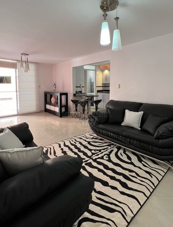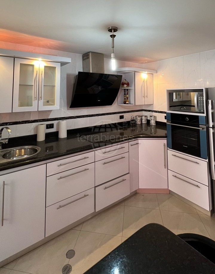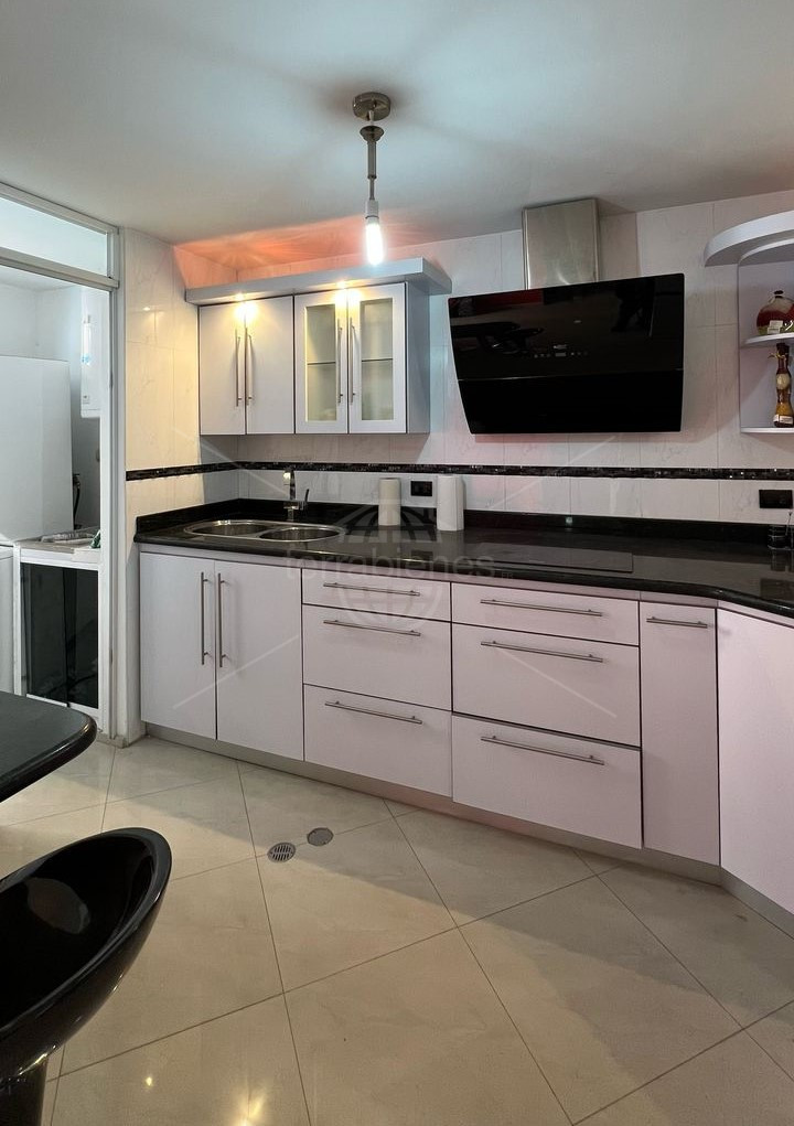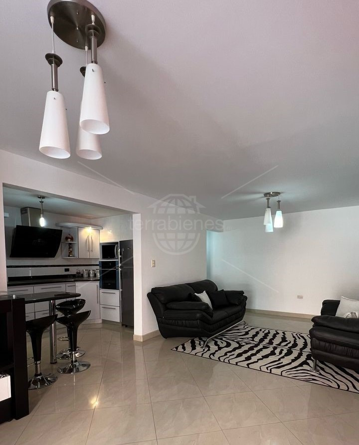 Sala, cocina empotrada con tope de granito, pisos de porcelanato.